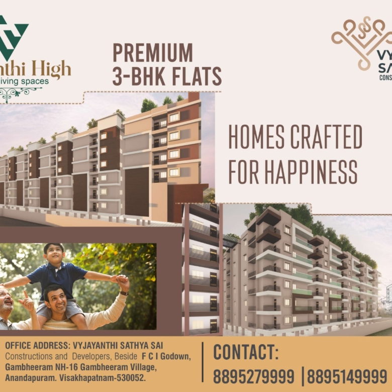 The Vyjayanthi High-End Living Spaces project is a premium residential development located in Gambheeram, Visakhapatnam, presented by Sathya Sai Constructions and Developers. Designed for modern living, the project offers spacious and luxurious 3-BHK apartments in a prime and fast-growing neighborhood adjacent to IIM Visakhapatnam.